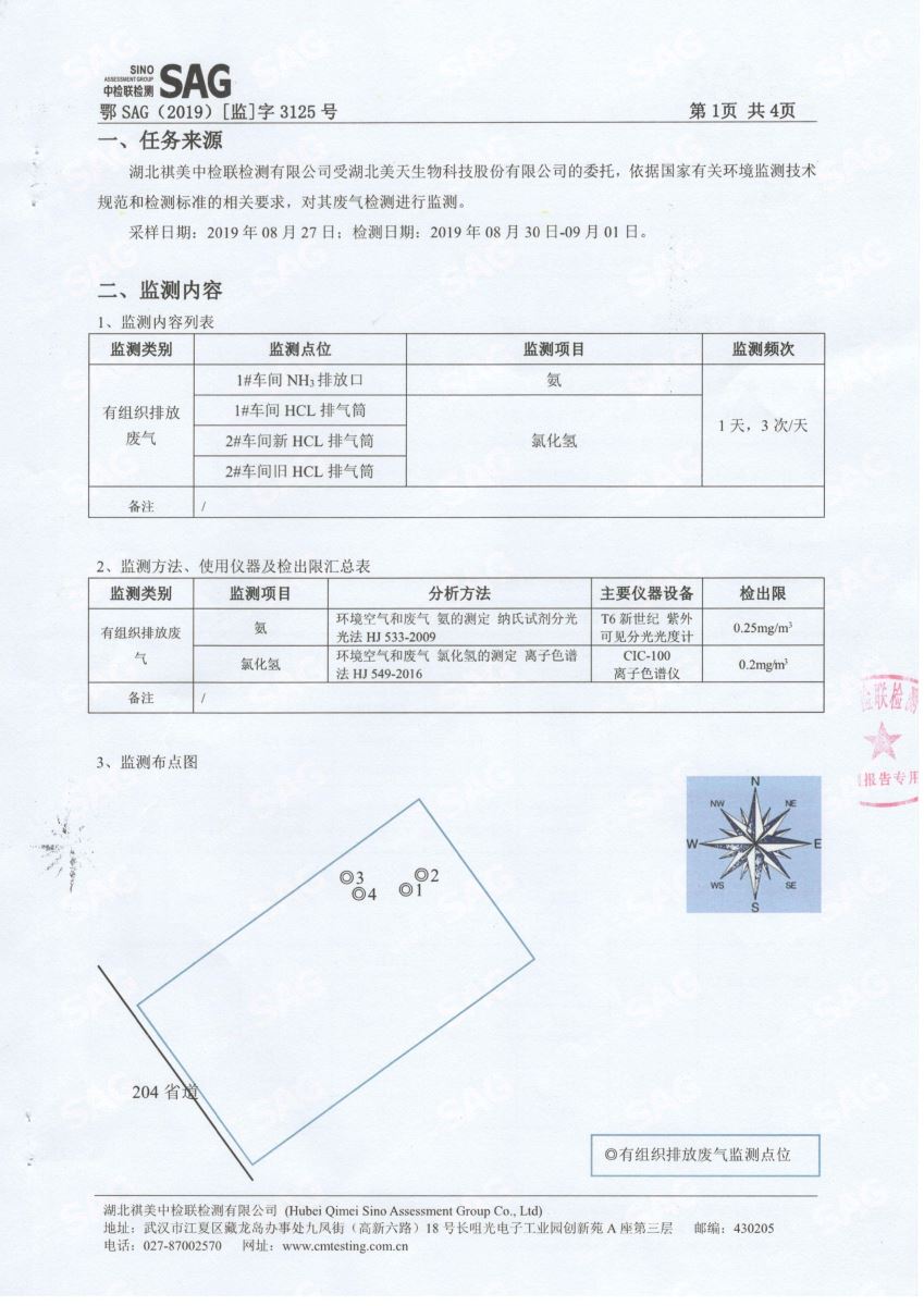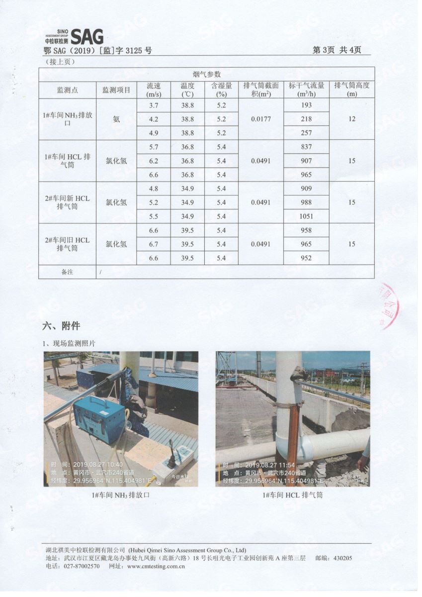 2019年第三季度,公司按照国家企业安全生产标准,对公司所排出的废气,委托第三方进行抽样检测,详细的检测报告如下