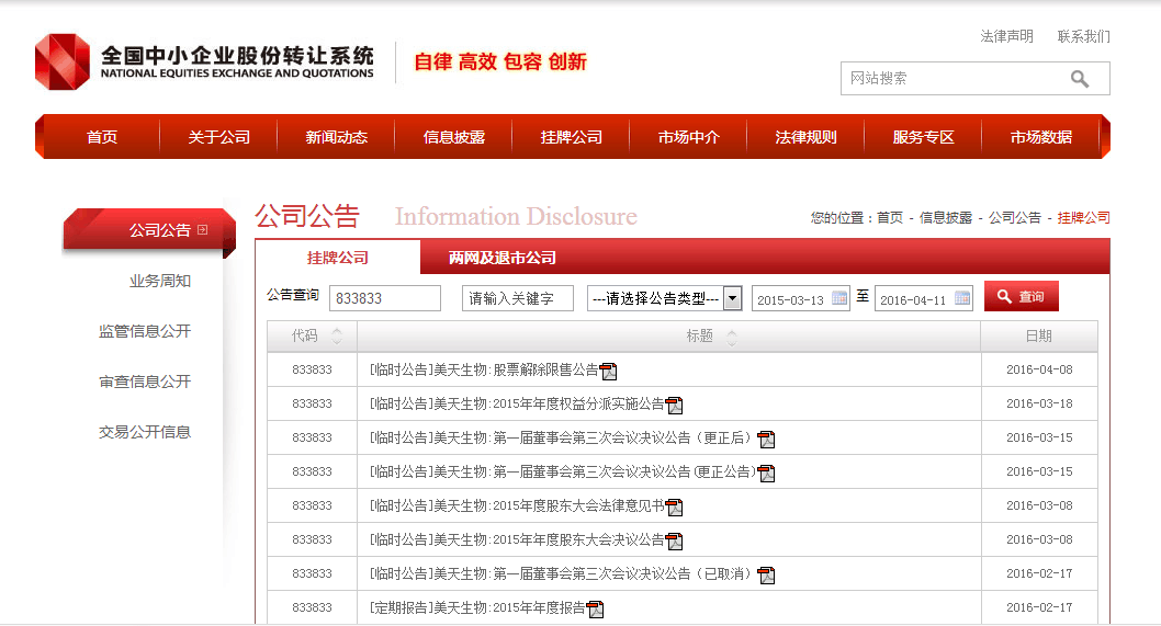 2016年4月8日,全国中小企业股份转让系统发布公告《美天生物股票解除限售公告》。